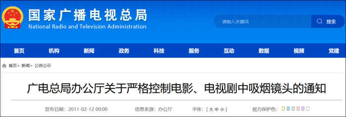 观察者网在国家广播电视总局官网查询发现,2011年2月12日,广电总局发布《关于严格控制电影、电视剧中吸烟镜头的通知》,规定电影和电视剧要严格控制与烟草相关的情节和镜头。严格控制以“艺术需要”、“个性化表达”为名出现的吸烟镜头,应尽量用其他形式代替以吸烟表现人物心理、现场氛围的情节;对确因剧情需要出现的吸烟镜头,应尽可能缩减吸烟镜头的时长和频率。此外,对于有较多吸烟镜头的电影、电视剧,将不纳入总局举办的各种电影、电视剧评优活动。
