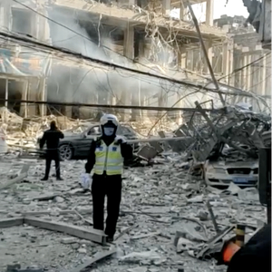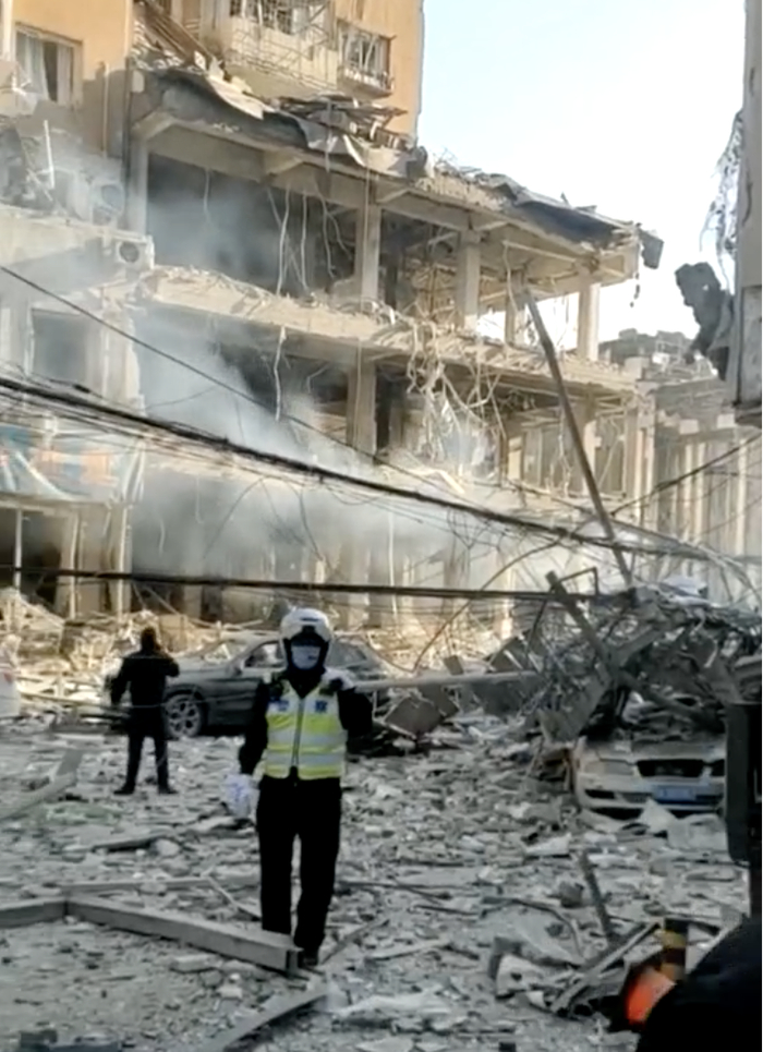 航拍沈阳爆炸现场救援画面:十字路口周边建筑损毁严重