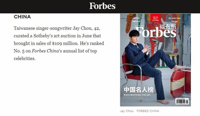 文中称,42岁的台湾歌手兼词曲作家周杰伦,在6月策划了苏富比的一场艺术品拍卖会,成交金额为1.09亿美元。他在福布斯中国年度名人榜上排名第五。