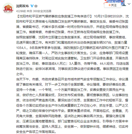 按照救援部署,沈阳市立即建立应急救援体系,成立现场指挥部、事故调查组,迅速开展处置工作。有关部门和属地政府共出动各类救援车辆307台、救援力量1054人,8名各类专家参与救援。消防搜救队伍对爆燃区域内部和外围已开展了4轮搜救,确保不漏一人,严防次生事故和灾害发生。公安、应急等部门现场设置隔离区维持秩序,对周边区域实施交通管制。卫生部门开设绿色通道,开展伤员救治工作。目前,事故造成4人死亡;3人重伤、伤情平稳,44人轻伤,均送往医院进行救治;安排36家宾馆,对事故波及群众进行妥善安置。事故原因正在调查之中。