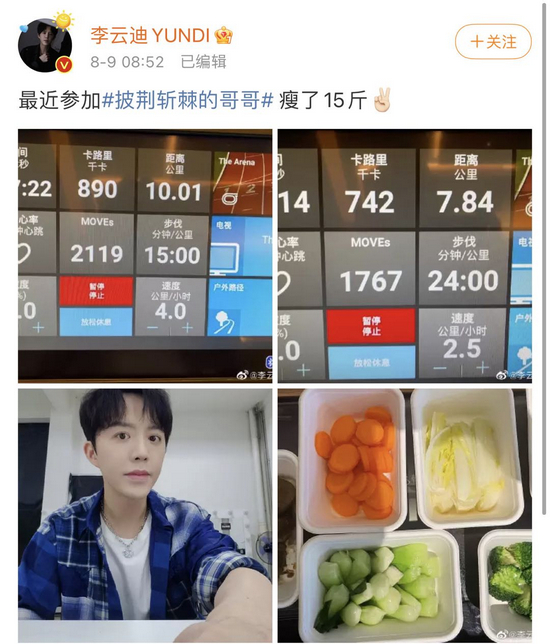 今年8月,李云迪参加上述节目,再次出现在公众视野。其最近发布社交动态也大多与上述节目相关。参与录制不久,李云迪就发布了跑步记录和蔬菜饮食照,并配文“瘦了15斤”。自拍照显示,他的脸部轮廓小了一圈,露出尖下巴,整个人显得非常精神清爽。
