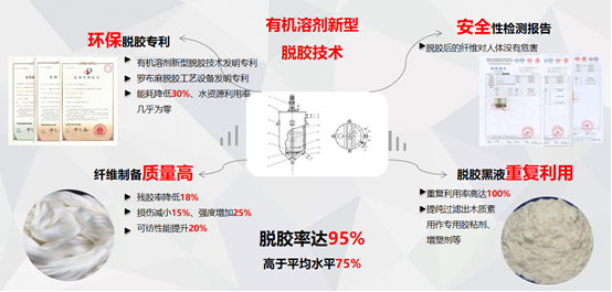项目中所采用的麻类纤维的有机溶剂新型脱胶技术,国内外尚无对该项技术的报道。它是利用有机试剂对麻类纤维胶质成分的溶解性,实现胶质与纤维素纤维的分离。有机溶剂新型环保脱胶工艺保持了纤维的良好物理性能,因而提高了产品的最大使用价值。