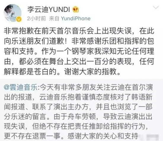 事件发生后,李云迪方第一时间的回应是:子虚乌有,被人陷害。随后越来越多的质疑声出现,他才在微博上承认“由于舟车劳顿出现失误”,向乐迷道歉。