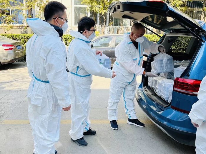 社区在小区西门设置了快递、外卖指定存放点,由工作人员和志愿者分批次统一配送至每家每户。昌平区供图(摄影:周紫欣)