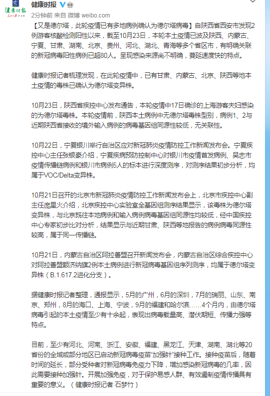 据健康时报记者整理,通报显示,5月的广州,6月的深圳,7月的瑞丽、山东、南京、郑州,8月的海口、上海、宁波,9月的福建和哈尔滨……4个月内,由德尔塔病毒引起的本土疫情至少有十余起,表现出病毒载量高、潜伏期短、传播力强等特点。
