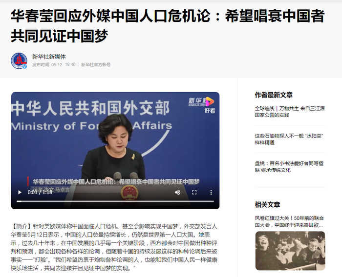 华春莹回应外媒中国人口危机论:希望唱衰中国者共同见证中国梦。5月12日,据新华社消息,针对美欧媒体称中国面临人口危机、甚至会影响实现中国梦,华春莹表示,中国的人口总量持续增长,仍然是世界第一人口大国。她表示,过去几十年来,在中国发展的几乎每一个关键阶段,西方都会对中国做出种种评判和预测,都会出现各种各样的论调,但随着中国的持续发展这样的种种论调后来被事实一一“打脸”。“我们希望热衷于炮制各种论调的人,也能和我们中国人民一样健康快乐地生活,共同去迎接并且见证中国梦的实现。”