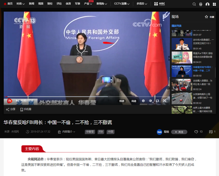 华春莹反呛FBI局长:中国一不偷,二不抢,三不撒谎。2019年7月24日,据央视网消息,华春莹表示,蓬佩奥(美国时任国务卿)公然宣称:“我们撒谎,我们欺骗,我们偷窃,这是美国不断探索前进的荣耀”。但是中国一不偷,二不抢,三不撒谎,我们完全是靠自己的智慧和汗水取得了今天骄人的成就。