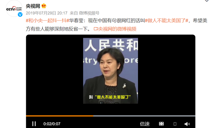 华春莹:做人不能太美国了。2019年7月29日,据央视网消息,7月29日,华春莹在主持例行记者会上表示:美方这次就WTO涉发展中国家地位的表态进一步暴露了美国的任性狂妄和自私自利。现在中国有句很网红的话叫“做人不能太美国了”,希望美方有些人能够深刻反省一下。