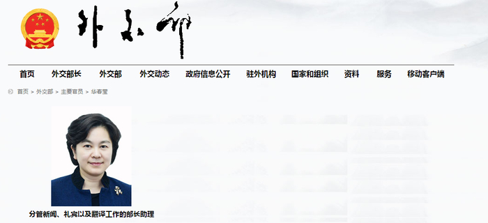 每经小编注意到,外交部官网“主要官员”一栏最新信息显示,华春莹已任外交部部长助理,分管新闻、礼宾以及翻译工作。她也是现任外交部“主要官员”中唯一一位“70后”。