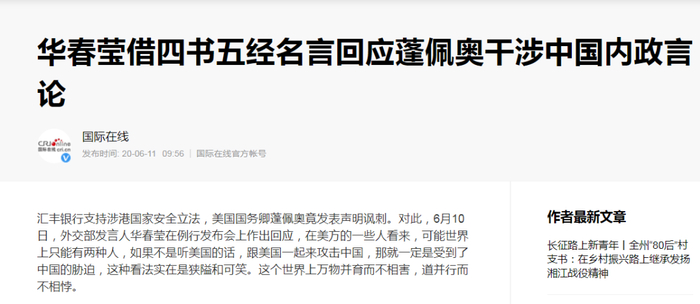 华春莹借四书五经名言回应蓬佩奥干涉中国内政言论。2020年6月11日,据国际在线消息,汇丰银行支持涉港国家安全立法,蓬佩奧(美国时任国务卿)竟发表声明讽刺。对此,6月10日,华春莹在例行发布会上作出回应,在美方的一些人看来,可能世界上只能有两种人,如果不是听美国的话,跟美国一起来攻击中国,那就一定是受到了中国的胁迫,这种看法实在是狭隘和可笑。这个世界上万物并育而不相害,道并行而不相悖。