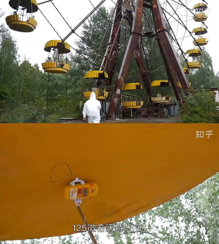 在辐射量较高的地方,包括网红们打卡的摩天轮处,则都需穿防护服,2019年郭杰瑞拍摄时,摩天轮座舱底部辐射量为125微希沃特/小时。