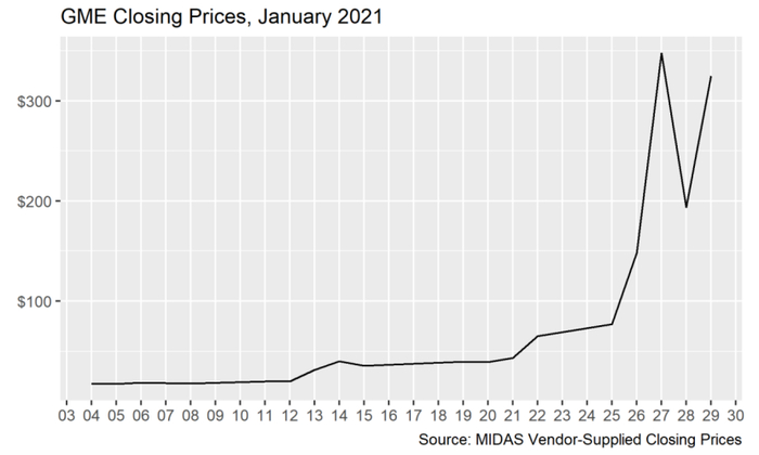 游戏驿站(GME)2021年1月收盘价走势图(来源:SEC报告)