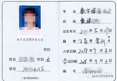 【应届生】扬州地区高校应届生学生证个人信息页及学籍注册信息页照片;