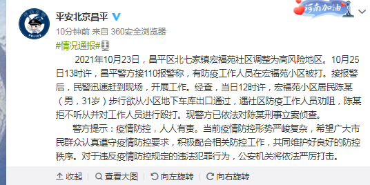 2021年10月23日,昌平区北七家镇宏福苑社区调整为高风险地区。10月25日13时许,昌平警方接110报警称,有防疫工作人员在宏福苑小区被打。接报警后,民警迅速赶到现场,开展工作。经查,当日12时许,宏福苑小区居民陈某(男,31岁)步行欲从小区地下车库出口通过,遇社区防疫工作人员劝阻,陈某拒不听从并对工作人员进行殴打。现警方已依法对陈某刑事立案侦查。