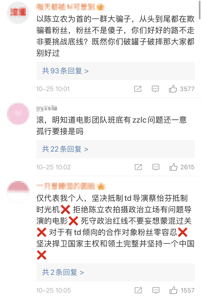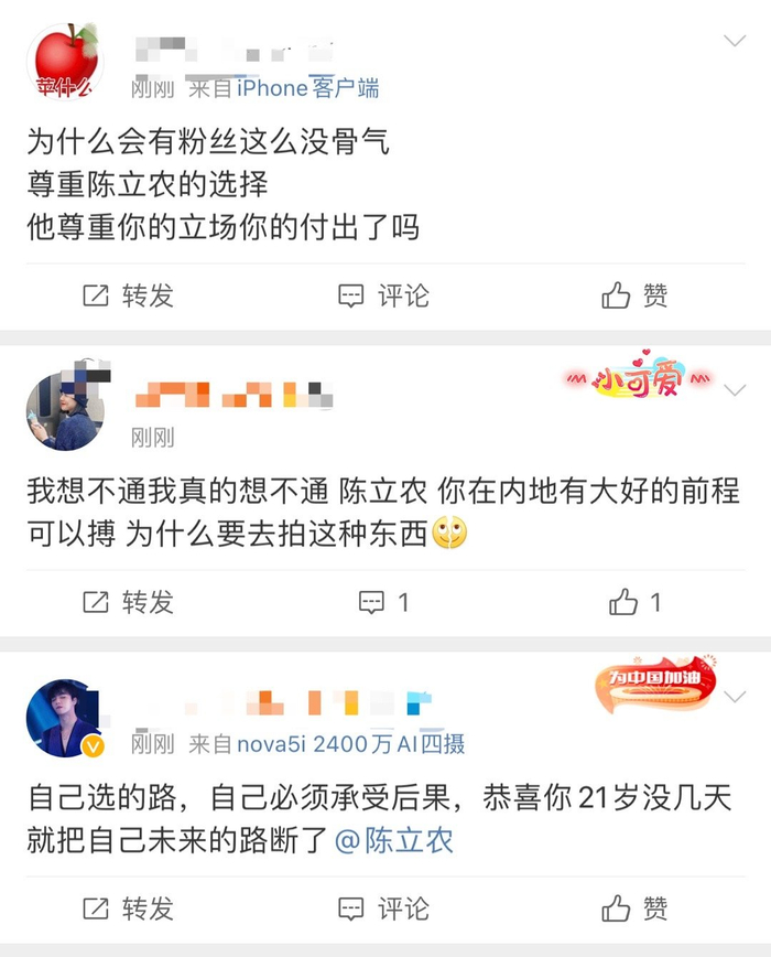 与此同时,陈立农的参演在台湾网民那里又惹了一身腥。因为他此前在大陆微博上多次转发爱国博文,与阿迪达斯解约支持新疆棉花等表态,遭到了岛内部分无理网民的攻击。