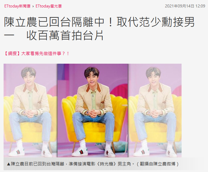 台媒报道称,陈立农此前曾出演大陆电影《赤狐书生》,虽然票房不佳但人气不受影响。台湾的电影公司看好他在大陆的人气,于是临时换角,以超百万新台币的片酬邀请他担任男主角。报道还透露,陈立农已决定明年返回台湾服兵役,将趁着年底前的空挡接拍本片,这也是他首度接演台湾电影。