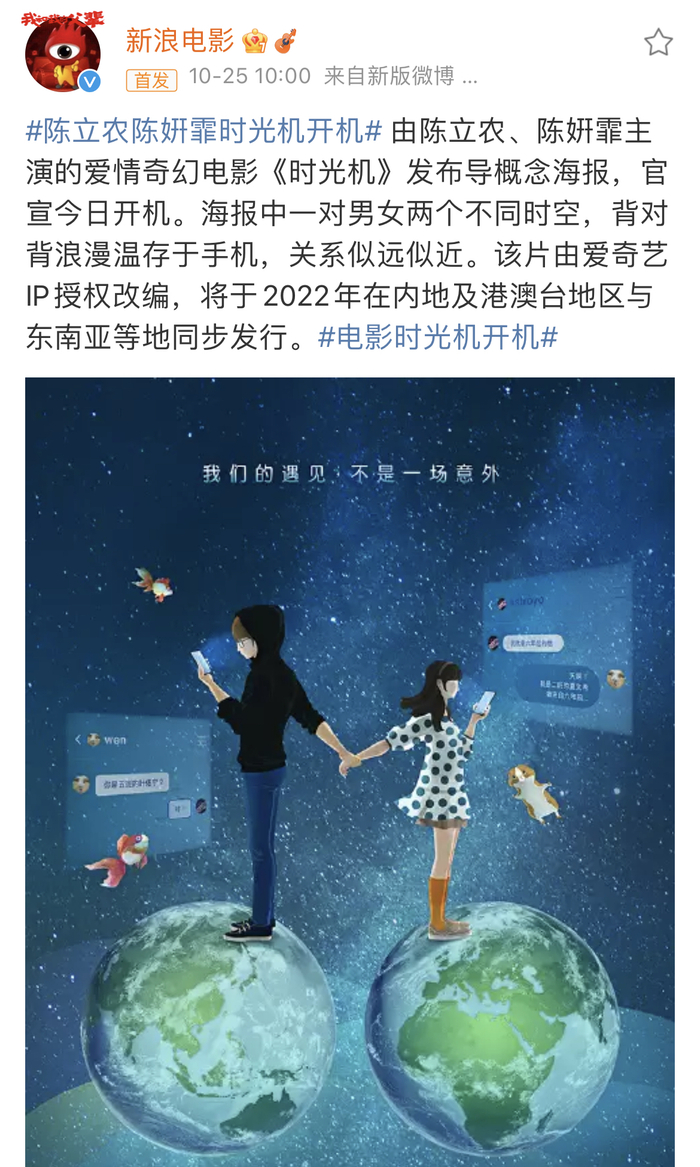 据多家影视媒体报道,由台湾艺人陈立农、陈姸霏主演的爱情奇幻电影《时光机》发布概念海报,官宣今日(25日)开机。