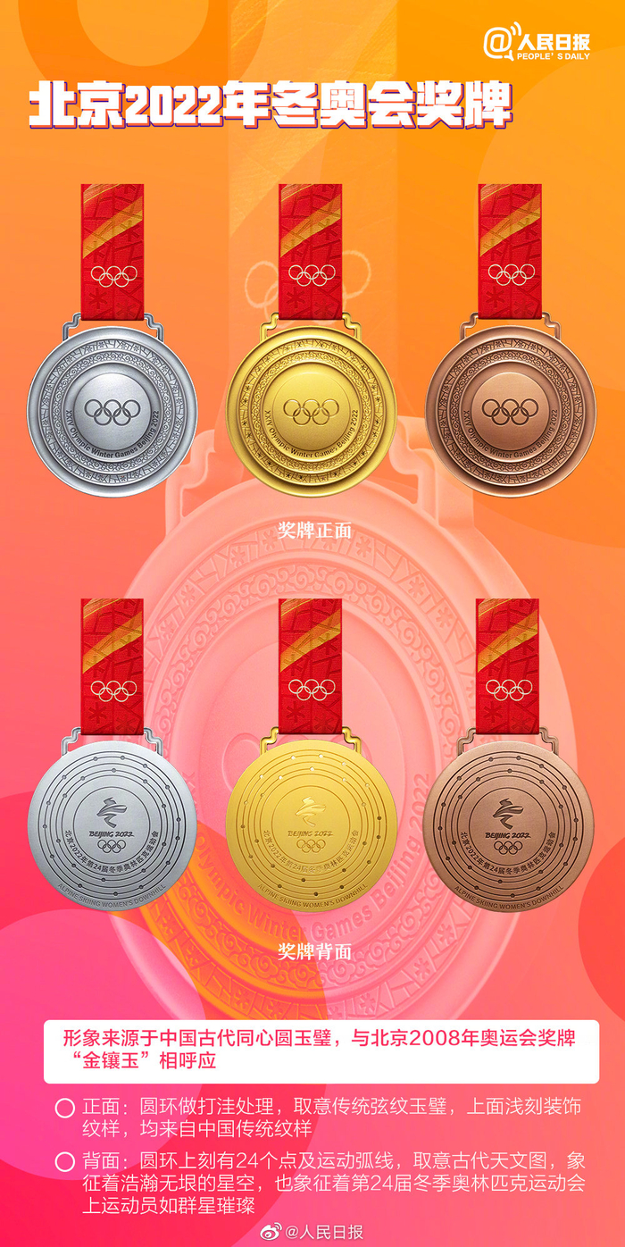 北京2022年冬奥会和冬残奥会奖牌都已揭晓!奖牌形象来源于中国古代同心圆玉璧,与北京2008年奥运会奖牌“金镶玉”相呼应。