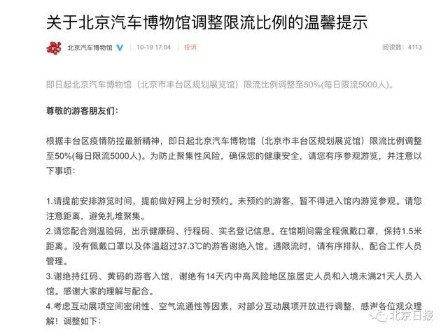 根据丰台区疫情防控最新精神,即日起北京汽车博物馆(北京市丰台区规划展览馆)限流比例调整至50%(每日限流5000人)。