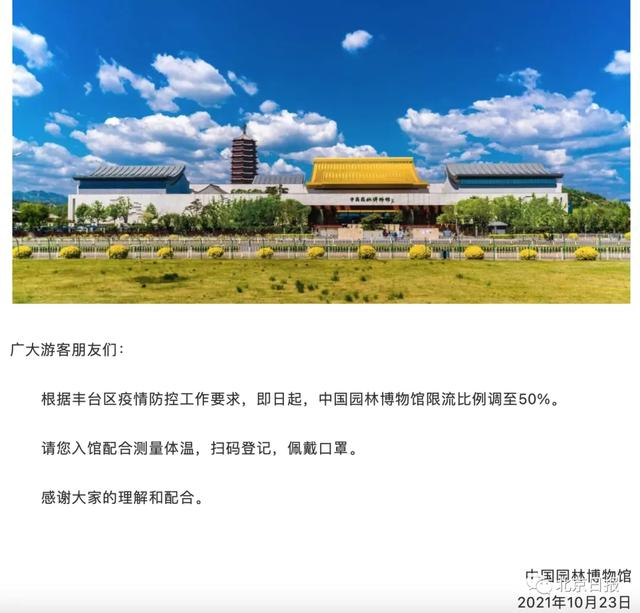 根据丰台区疫情防控工作要求,即日起,中国园林博物馆限流比例调至50%。