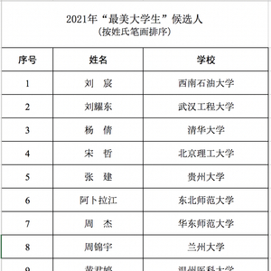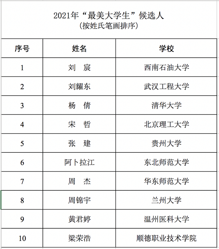 公示名单显示,10名候选人分别为:西南石油大学刘宸,武汉工程大学刘耀东,清华大学杨倩,北京理工大学宋哲,贵州大学张建,东北师范大学阿卜拉江,华东师范大学周杰,兰州大学周锦宇,温州医科大学黄君婷,顺德职业技术学院梁荣浩。