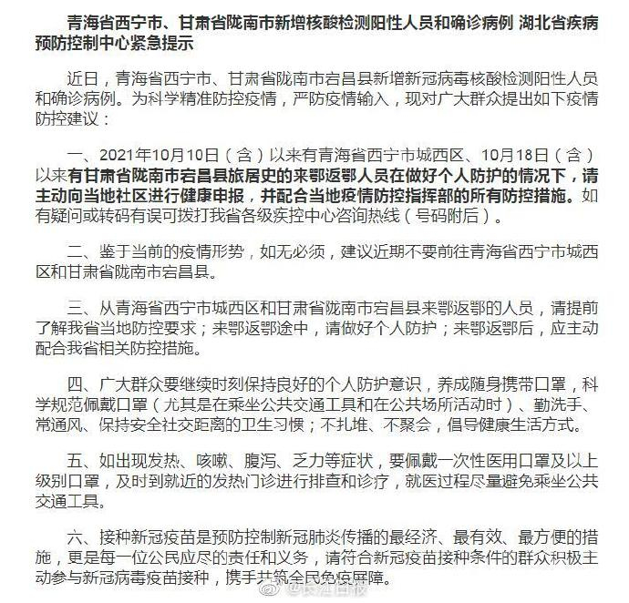 近日,青海省西宁市、甘肃省陇南市宕昌县新增新冠病毒核酸检测阳性人员和确诊病例。为科学精准防控疫情,严防疫情输入,现对广大群众提出如下疫情防控建议→O网页链接 (来源:湖北疾控)