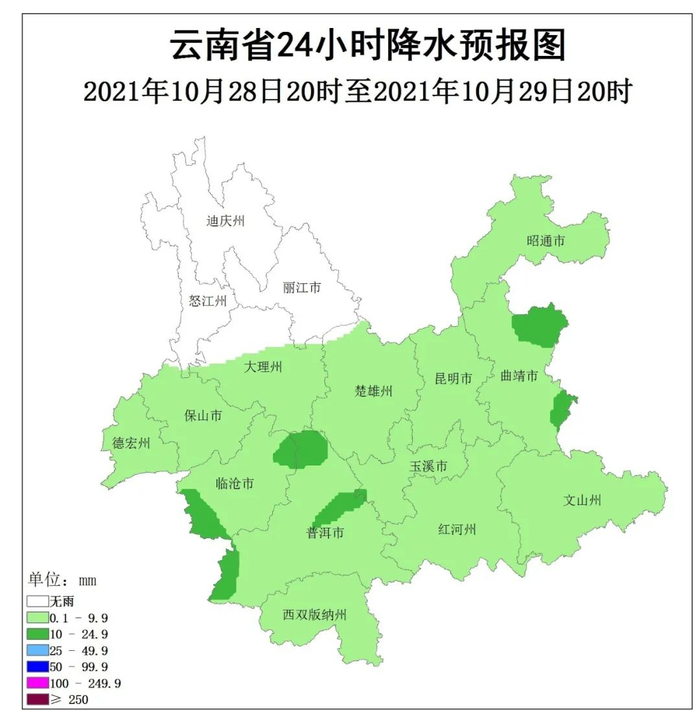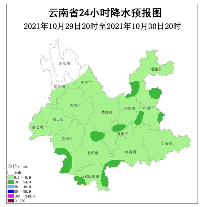 昭通东部、曲靖东部和南部、文山北部、昆明南部、玉溪、红河南部、普洱东部和南部、西双版纳东部阴有小到中雨局部大雨,其它地区多云有阵雨局部中雨。