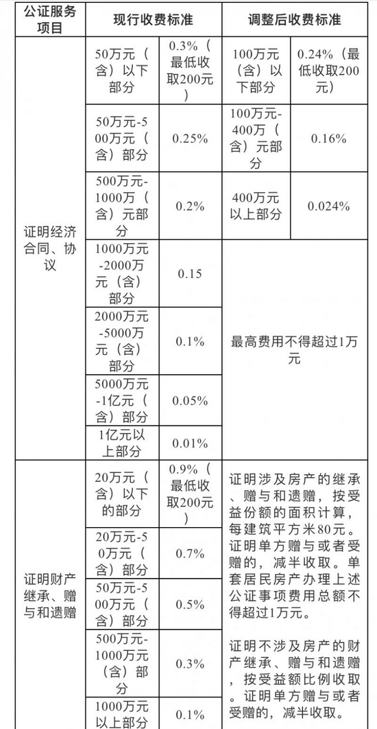 “证明合同、协议”公证事项,则合理设立阶梯递减费率,进一步降低按标的金额比例计价标准,由原按标的金额比例七档计价调整为按标的金额比例三档计价,并将第一档费率由0.3%降为0.24%,平均收费额降幅约17%。