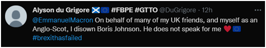 有英国网友则直接@马克龙,撇清自己和约翰逊的关系:“谨代表我自己和我许多的英国朋友,我们不承认约翰逊。他可不代表我。”↓
