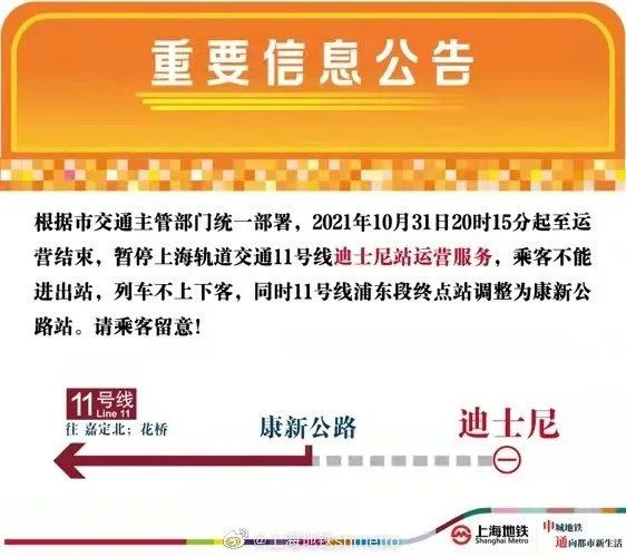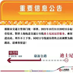 根据市交通主管部门统一部署,2021年10月31日20时15分起至运营结束,暂停上海轨道交通11号线迪士尼站运营服务,乘客不能进出站,列车不上下客,同时11号线浦东段终点站调整为康新公路站。请乘客留意!