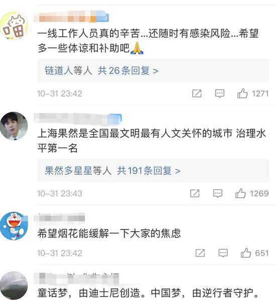 面对疫情防控,人民日报微博称,10月31日晚,上海迪士尼,烟花在夜空中清冷绽放。医护人员和民警逆行入园,投入紧张有序的核酸检测工作。网友:眼眶热了,感谢所有为我们负重前行的人!