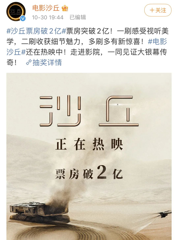 自22日首映后,好莱坞科幻大片《沙丘》在北美院线登顶上周末票房冠军,揽下4100万美元(约合人民币2.61亿元)票房,在全球更获得超2.32亿美元(约合人民币14.81亿元)票房,30日影片在中国大陆的票房也突破了2亿元人民币。