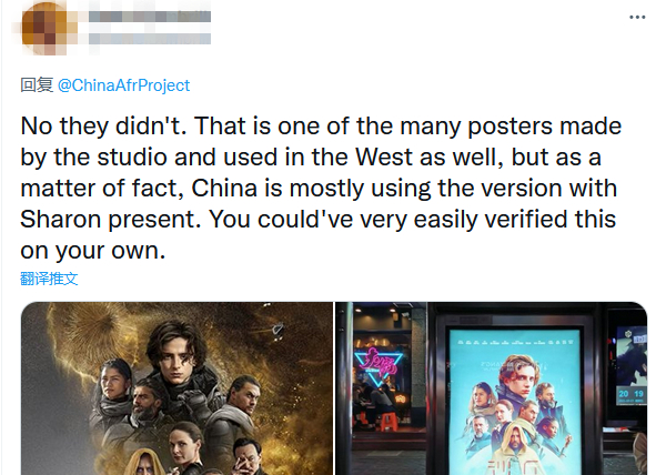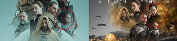 而就在同一天,英国《每日邮报》援引“中非项目”的说法,称《沙丘》在中国大陆上映时,所使用的宣传海报删去了英国黑人女演员莎伦·邓肯-布鲁斯特(Sharon Duncan-Brewster)的肖像,取而代之的是中国台湾男演员张震。