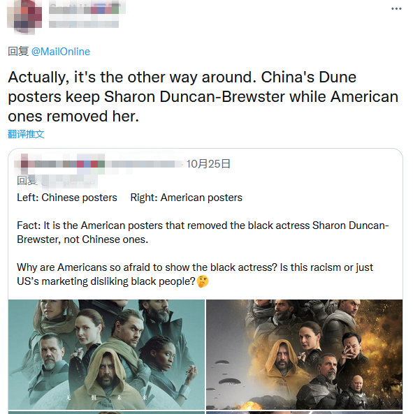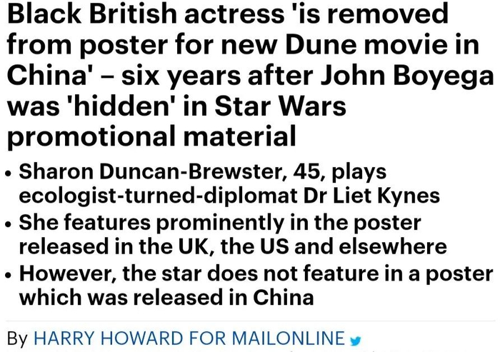 《每日邮报》宣称“英国黑人女演员从《沙丘》中国版海报中被移除”