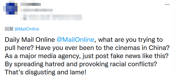 还有网友大骂道:“《每日邮报》你在这儿放什么X?你去过中国的电影院吗?作为大媒体就这样发布假新闻?通过传播仇恨和挑起种族冲突?太恶心人了!”