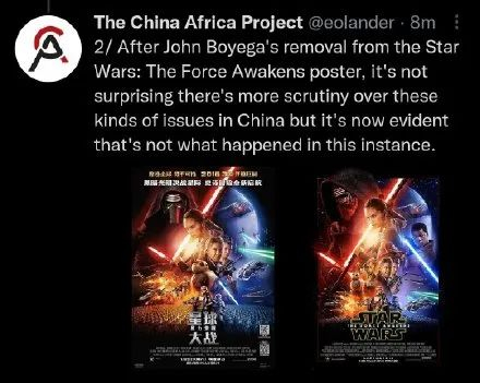 话音一转,报道又称让黑人女演员从海报上“消失”可能是好莱坞为了“取悦”中国市场而做出的特别调整,顺带旧事重提,称“2015年《星球大战7:原力觉醒》的中国海报缩小了黑人演员约翰·波耶加(John Boyega)的形象”,以此作为佐证来暗示中国存在“种族歧视”、“歧视黑人演员”,一波节奏带得飞起。