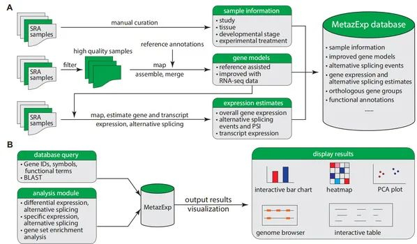 为消除生物学研究人员和大数据之间的沟渠,提升公共数据的利用率,该团队将情报学的数据采集、信息组织、领域知识挖掘方法应用于生物信息领域。以72种后生动物为对象,全面搜集整理了对应的53 615个测序数据,对样品品系、基因型、组织、发育阶段、处理条件等重要生物学属性进行了标注,开发pipeline优化基因模型、识别可变剪接事件、完善基因组注释,并对测序样本中基因表达和可变剪接水平分别在多个层次上进行定量。在此基础上,开发了具有检索和在线分析功能的平台,可自动生成各种实用图表,以便科研人员获得有意义的生物学见解,为深入研究相关基因功能提供有价值的参考。