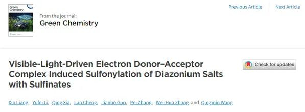 近日,绿色和可持续科技领域的国际权威期刊Green Chemistry在线发表了南京农业大学理学院章维华、夏青团队完成的题为“Visible-Light-Driven Electron Donor–Acceptor Complex Induced Sulfonylation of Diazonium Salts with Sulfinates”的研究论文。该研究发展了可见光促进EDA复合物(electron donor–acceptor complex)引发的亚磺酸钠与芳基重氮盐的磺酰化反应,成功实现了芳基砜类化合物的绿色、经济、便捷的构建方法。