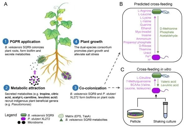 近日,资环学院土壤微生物与有机肥团队张瑞福教授课题组的最新研究成果发现,施用典型根际益生芽孢杆菌SQR9不仅可以独自促进植物生长,其代谢产物还能诱导土著“帮手”微生物—施式假单胞菌(Pseudomonas stutzeri)的显著富集,并与菌株SQR9共同在植物根际形成稳定的混菌生物膜。合成菌群的代谢建模、代谢组学分析以及功能基因敲除实验证明菌株SQR9能与土著施式假单胞菌代谢互养(Cross-feeding),拓宽了双菌菌群在植物根际的生态位宽度,并且这种代谢依赖驱动两株植物益生菌的长期共存,协同增强植物益生能力。该成果以“Bacillus velezensisstimulates resident rhizospherePseudomonas stutzerifor plant health through metabolic interactions”为题刊发微生物生态学领域著名期刊《The ISME Journal》。