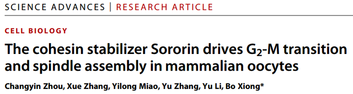 综上所述,该研究揭示了黏合素稳定因子Sororin在减数分裂中作为哺乳动物卵母细胞G2-M转换和纺锤体组装调控因子的非经典功能,拓展了人们对染色体黏合蛋白所参与生物学过程的认知,同时也为研究人类和家畜卵母细胞减数分裂成熟障碍的发生原因提供了新的思路和理论依据。