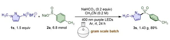 该研究探寻了该磺酰化反应成规模化应用于工业生产的可能性。之前已有文献报道过以四步反应,总收率低于10%的方法得到吡唑芳基砜化合物3s(Eur. J. Med. Chem., 2009, 44, 2313)。与之相比,该研究使用6.8 mmol对甲苯亚磺酸钠2a与1-甲基吡唑重氮盐1s在标准反应条件下反应24 h,最终可生成1.43 g吡唑芳基砜化合物3s,收率达到89%。