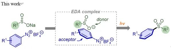 本研究首次发现了可见光促进EDA复合物引发的磺酰化反应,用于芳基/杂芳基重氮盐和亚磺酸钠在温和的反应条件下的偶联反应。该反应的特点是条件温和、操作简单,避免使用过渡金属、配体、催化剂和氧化剂。该反应具有高原子经济性、官能团广泛的适用性以及对药物中间体和天然产物衍生物的兼容性,为未来工业生产中实现绿色、高效的砜基化反应提供了可靠的方法。