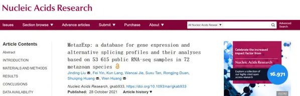 近日,信息管理学院黄水清教授课题组研制完成后生动物基因表达和可变剪接数据分析平台(https://bioinfo.njau.edu.cn/metaExp),成果“MetazExp: a database for gene expression and alternative splicing profiles and their analyses based on 53 615 public RNA-seq samples in 72 metazoan species”在生物信息学领域权威期刊Nucleic Acids Research(IF=16.9)在线发表。