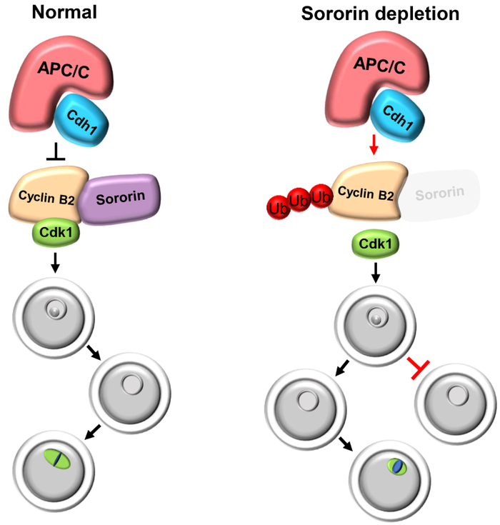 该研究中,为了探索Sororin在卵母细胞减数分裂过程中的作用,研究人员首先观察了卵母细胞发育成熟的两个关键事件,G2-M转换(减数分裂恢复)和第一极体排出(减数分裂成熟)。结果显示Sororin缺失导致卵母细胞G2-M转换受损和成熟率下降。进一步检测G2-M转换相关调节分子的蛋白水平,发现细胞周期蛋白Cyclin B2在Sororin缺失卵母细胞中显著减少,而表达外源Cyclin B2能挽救G2-M转换缺陷。此外,实验表明Sororin与Cyclin B2在卵母细胞中存在相互作用,提示Cyclin B2是Sororin的下游效应因子。同时,研究人员发现Sororin缺失的卵母细胞呈现出与Cyclin B2缺失相似的纺锤体形态异常,明确了Cyclin B2介导Sororin在纺锤体组装中的功能。最后,研究人员阐明了Sororin缺失引起Cyclin B2蛋白量下降的分子机制,证明Sororin可保护Cyclin B2免受E3泛素连接酶APCCdh1的降解以维持其正常蛋白水平,从而驱动卵母细胞G2-M转换和纺锤体组装,并且这一作用机制在小鼠和猪卵母细胞中是保守的。