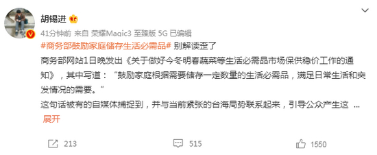 胡锡进:商务部鼓励家庭储存生活必需品 别解读歪了