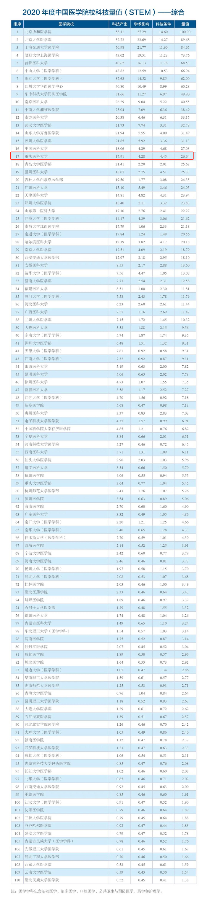 10月31日,2020年度中国医学院校科技量值(STEM)排名发布。重庆医科大学排名稳步上升,较上一年度提升了3位,在110所具有医学类相关学科专业研究生招生资格的独立医学院校以及设置医学类相关学科的综合性大学中,位列综合排名第17位,位列省部共建医科院校第5名。