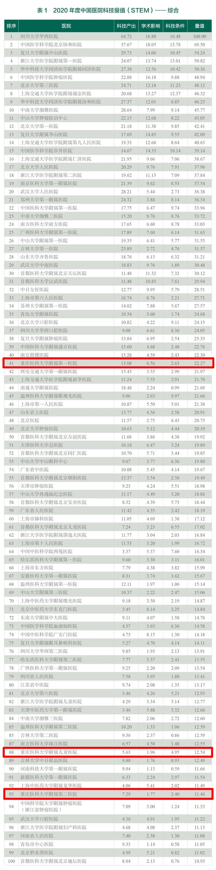 综合排名中,重庆医科大学附属第一医院排名第41位,附属儿童医院排名第88位,附属第二医院排名第93位。10个学科进入学科排行榜前20名。