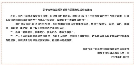 一、即日起至2021年11月9日24时,全区范围内暂停所有聚集性活动,暂停开放KTV、网吧、酒吧、棋牌室、麻将馆、电影院、电子娱乐室等室内文化娱乐场所。