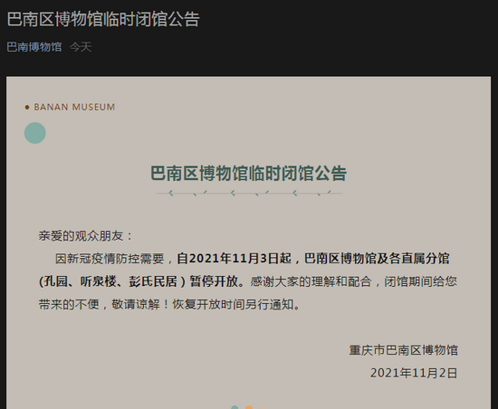 自2021年11月3日起,巴南区博物馆及各直属分馆(孔园、听泉楼、彭氏民居)暂停开放。感谢大家的理解和配合,闭馆期间给您带来的不便,敬请谅解!恢复开放时间另行通知。