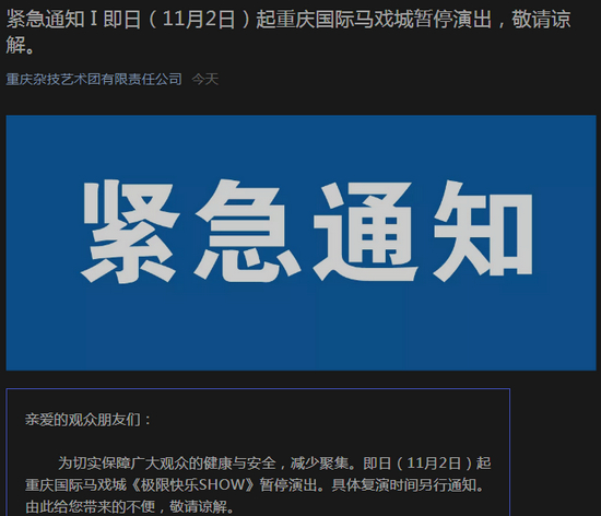 即日(11月2日)起重庆国际马戏城《极限快乐SHOW》暂停演出。具体复演时间另行通知。
